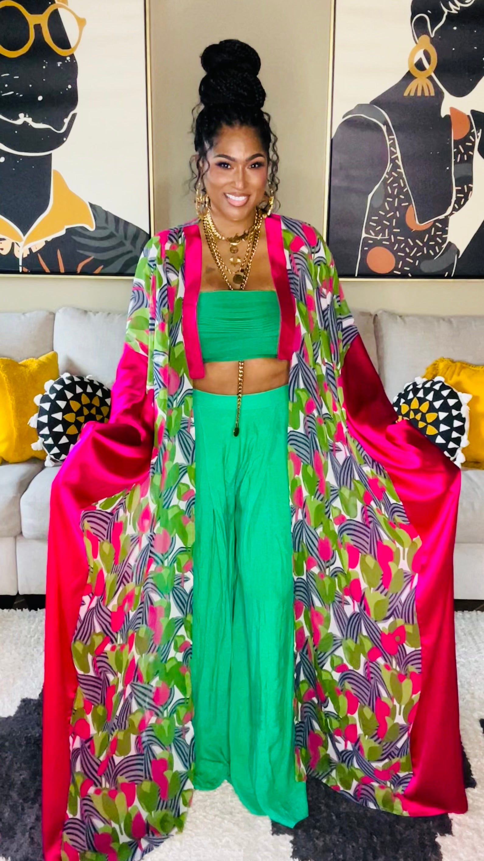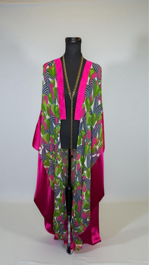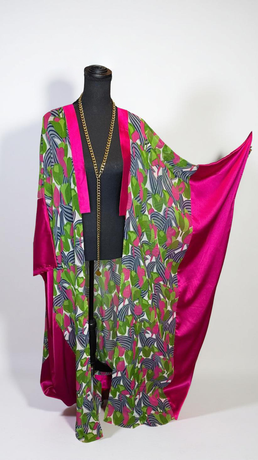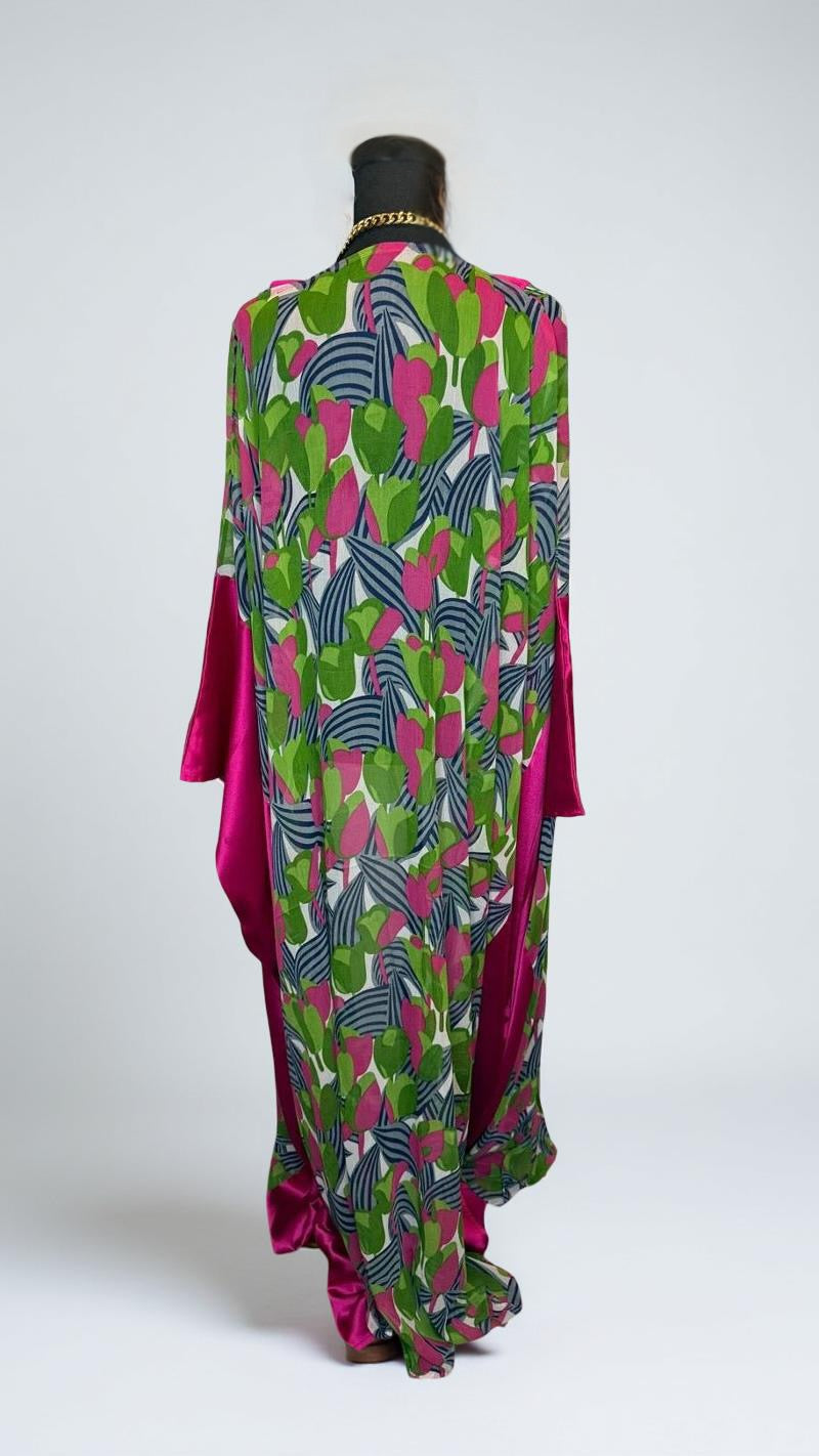 Pink & green floral patterned chiffon with pink lapel & side trim.
