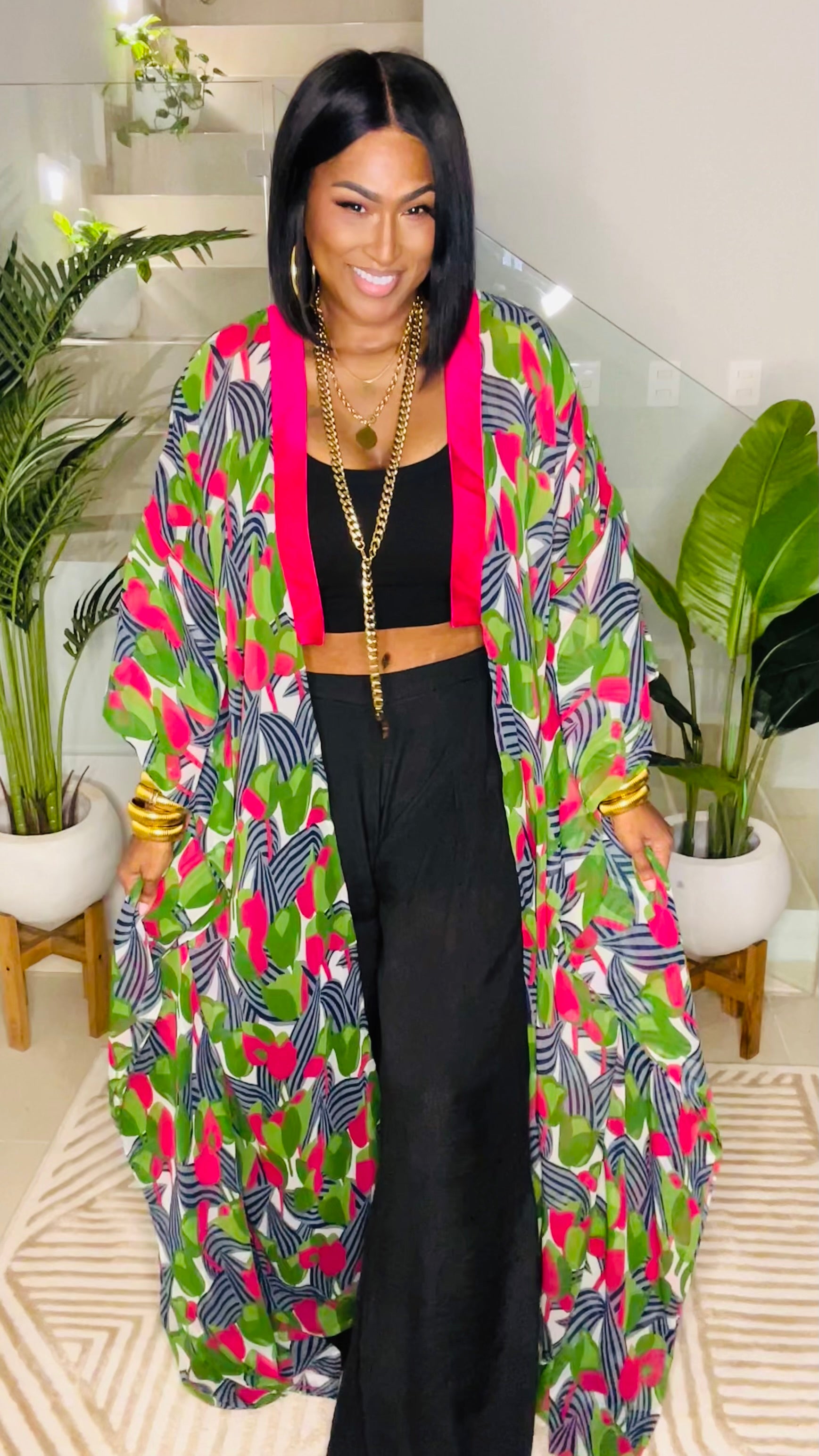 Fuschia & green floral patterned chiffon with fuschia satin lapel & side trim.