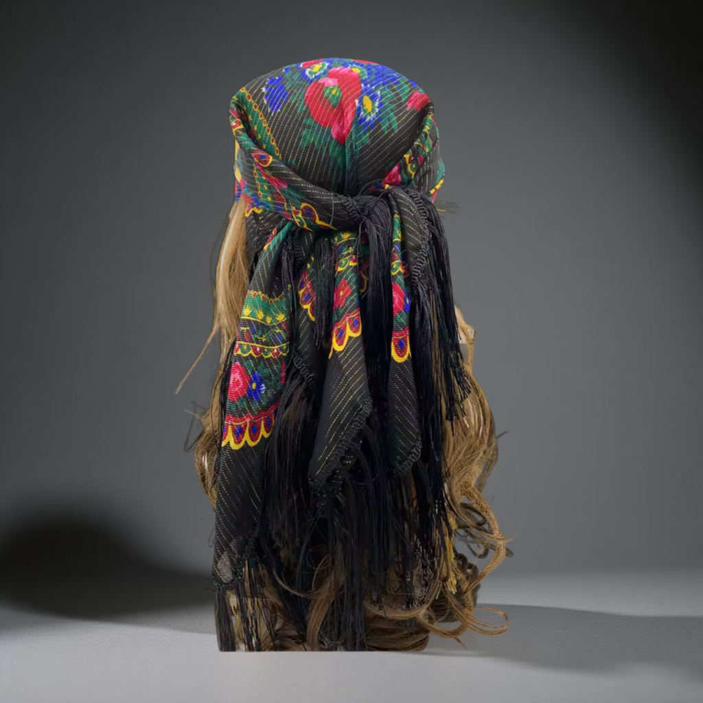 28" x 28" gold threaded viscose scarf with 8" fringe trim.
