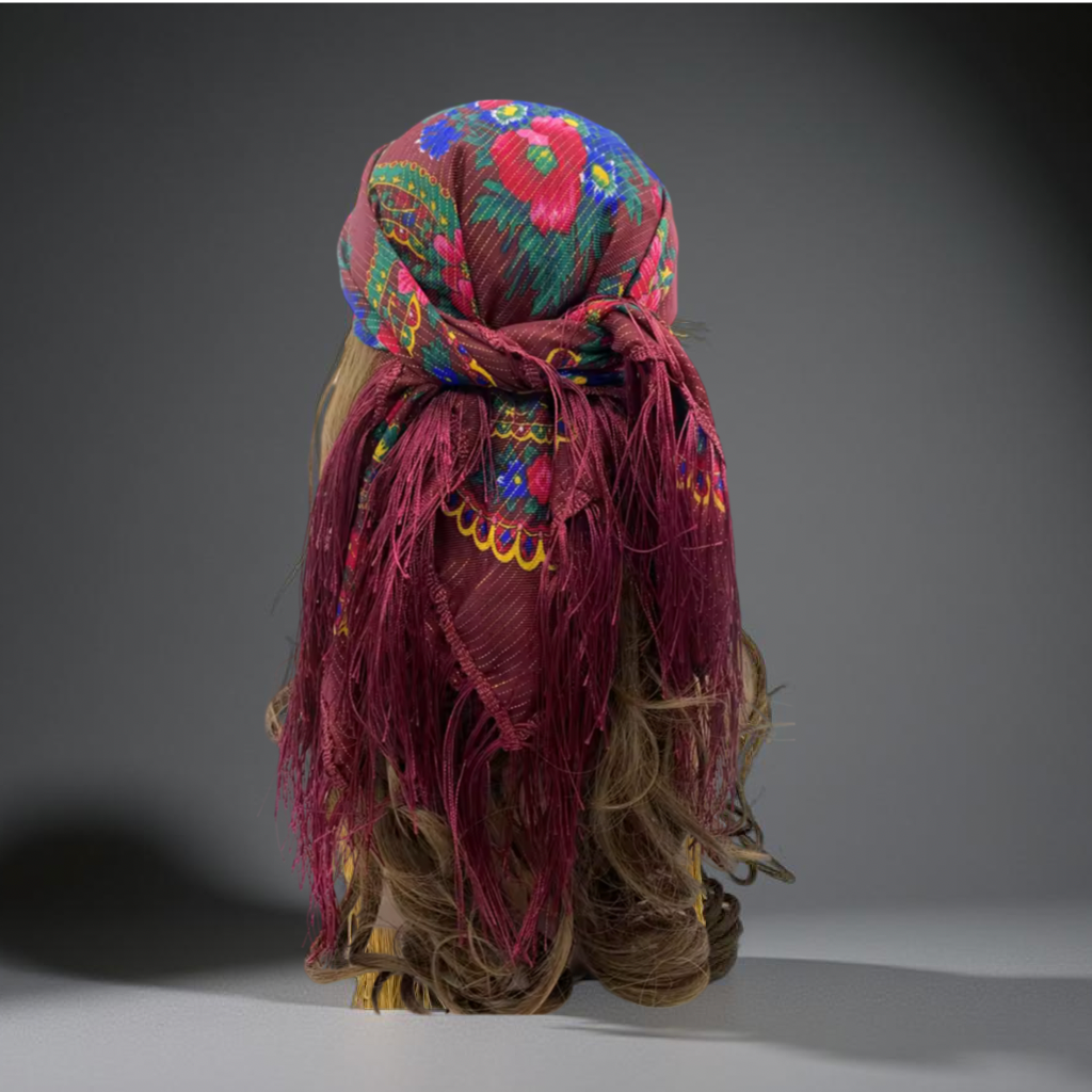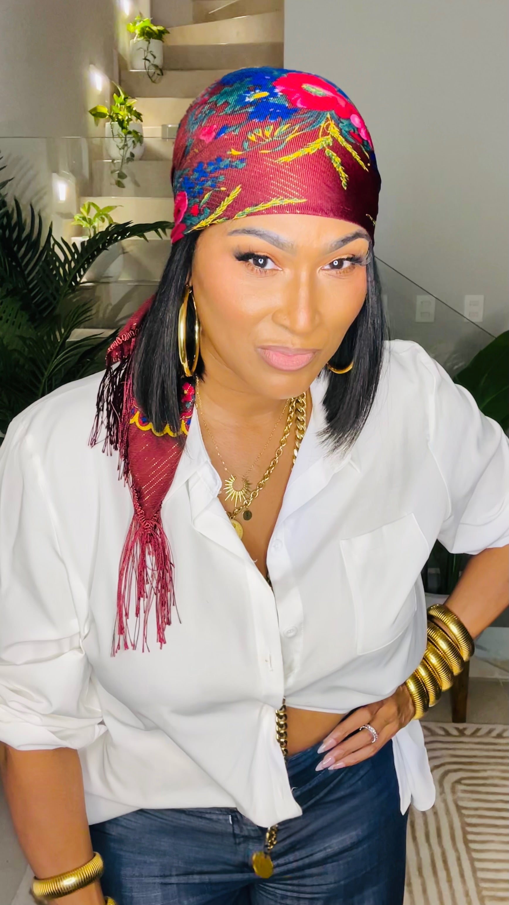 28" x 28" gold threaded viscose scarf with 8" fringe trim.