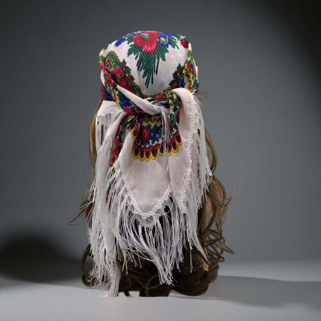 28" x 28" gold threaded viscose scarf with 8" fringe trim.