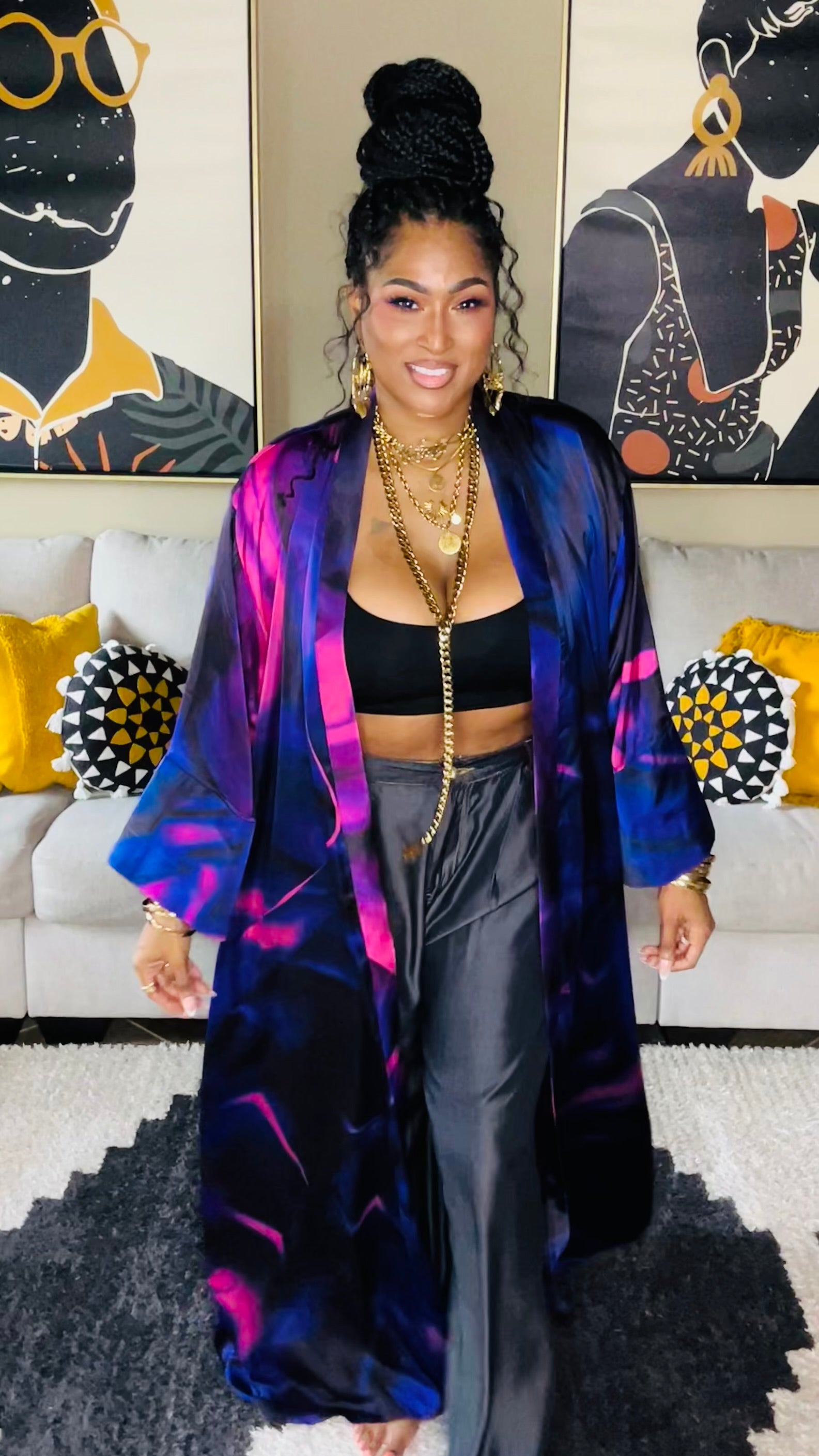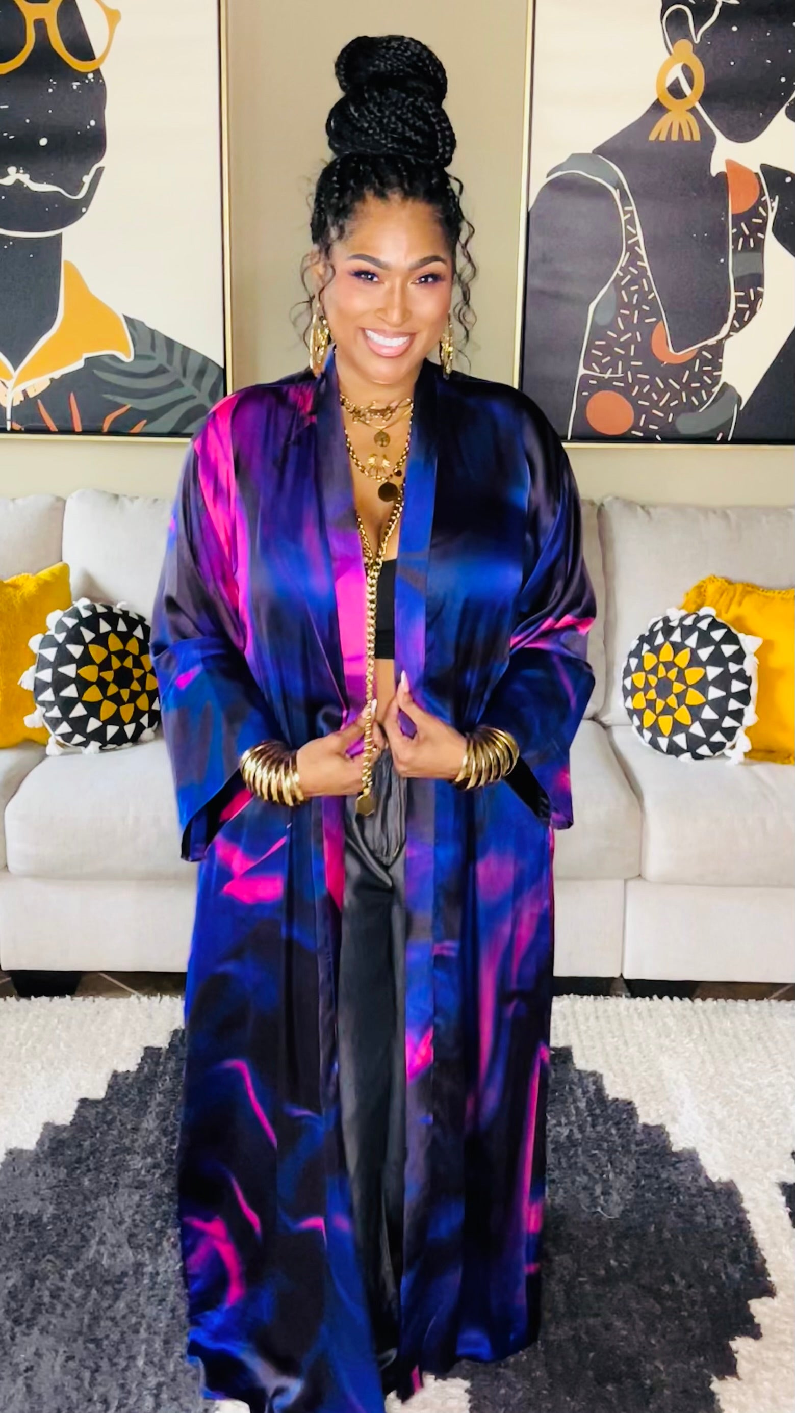 58” length kaftan with side pockets & matching waist tie.